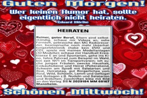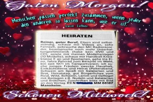 | Guten Morgen! Weisheit zum Heiraten Bild (673.17 KB) Herziges → guten-Morgen-Bilder → Mittwoch Guten Morgen | Herziges → guten-Morgen-Bilder → Mittwoch | 31.05.-21:32 | |||