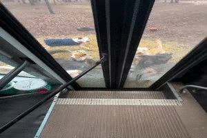 Hund schaut durch kaputte Tür