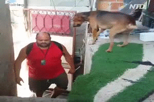 Dieser Hund ist cool. Er öffnet die Türe, trägt das Essen rein und knallt dem Typ die Türe dann vor der Nase wieder zu :-)