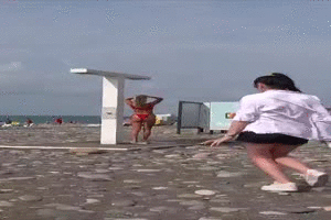 Ein vollbusiges Mädchen spielt ihrer ebenfalls vollbusigen Freundin einen sehr sexy, aber auch echt gemeinen Streich: Während die heiße Brünette beim Sonnen schläft, wird ihr Bikini-Oberteil angeschnitten und eine Plastik-Krabbe auf ihr Bein gelegt. Als sie aufwacht und die Krabbe sieht, springt sie erschrocken auf, steht überrascht oben ohne da, und versucht mit ihren Händen ihre großen Titten zu verstecken, nachdem das präparierte Oberteil abgefallen ist.