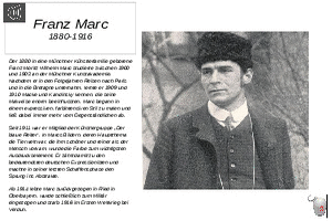 Da ich selbst einmal gezeichnet-gemalt habe, habe ich mit 50 ausgewählten Künstler, die in den letzten 5 Jahrhunderten einzigartige Kunstwerke erschufen, eine PowerPoint-Serie erstellt. (Nr. 42, Franz Marc, 1880-1916)