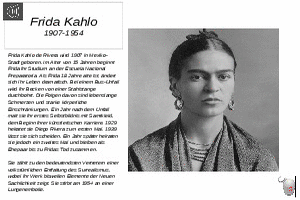 Da ich selbst einmal gezeichnet-gemalt habe, habe ich mit 50 ausgewählten Künstler, die in den letzten 5 Jahrhunderten einzigartige Kunstwerke erschufen, eine PowerPoint-Serie erstellt. (Nr. 48, Frida Kahlo, 1907-1954)