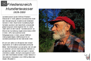 Da ich selbst einmal gezeichnet-gemalt habe, habe ich mit 50 ausgewählten Künstler, die in den letzten 5 Jahrhunderten einzigartige Kunstwerke erschufen, eine PowerPoint-Serie erstellt. (Nr. 50, Friedensreich Hundertwasser, 1928-2000)