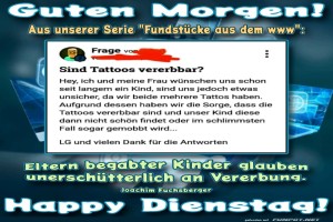 | Sind Tattoos vererbbar? Morgenhumor! Bild (478.77 KB) 1Herziges → guten-Morgen-Bilder → Dienstag Guten Morgen | Herziges → guten-Morgen-Bilder → Dienstag | 18.06.-22:50 | ||