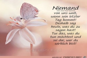 | Niemand von uns weiß wenn der letzte Tag kommt Bild (42.54 KB) 6Herziges → Nachdenkliches | Herziges → Nachdenkliches | 21.07.22-11:01 | Floh | |