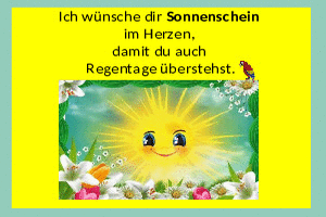| Die Sonne für dich scheinen Powerpoint (1.94 MB) 11Herziges → ich wünsche dir... Die Sonne soll in deinem Leben scheinen. Das wünsche ich dir von Herzen. | Herziges → ich wünsche dir... | 29.04.-15:32 | Sirene | |