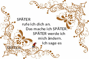 | Später Powerpoint (1.03 MB) 8Herziges Wir verschieben Dinge gerne auf später, ohne und manchmal im Klaren zu sein, dass später auch mal "nicht mehr" heißen kann. Deshalb lebe jetzt und genieße jeden einzelnen Moment. | Herziges | 24.06.-16:46 | Sirene | |