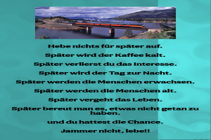 | hebe nichts für später auf Bild (3.53 MB) 1Herziges → Sprüche | Herziges → Sprüche | 18.07.-18:40 | ||