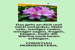 | Manchmal möchte man auch etwas Tiefsinniges lesen und schaut dann hier rein. Denn auf funpot haben wir unendlich viele herzige Präsentationen, Videos und Bilder mit Sprüchen und Lebensweisheiten. Aber nicht nur tiefsinnige Dinge findest du hier. Z.B. erfeuen die netten guten-Morgen-Bilder mit ihrem herzlichen Charme, animierte Engelssprüche blinken fröhlich mit guten Wünschen und wenn es einfach nur süß sein soll, dann findest du hier auch drollige Tierbabys, Glücksbärchen und vieles mehr. Schau regelmäßig vorbei - ständig laden unsere Leser neue wunderschöne Dateien hoch und wir sind permanent dran diese für euch in die entsprechenden Interessensgebiete einzuordnen, sodass du ständig etwas Neues in deiner Lieblingskategorie vorfindest. | ||||||