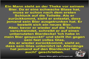| Ein Mann steht an der Theke vor seinem Bier Bild (78.75 KB) von Fossy am 06. April 2026 um 09:49 Uhr Lustiges → klasse Sprüche und Witze | Lustiges → klasse Sprüche und Witze | 06.04.-09:49 | Fossy | ||