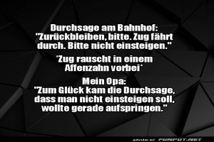 | Opa vs. Zug: Ein Duell am Bahnsteig Bild (80.08 KB) am 01. Dezember 2025 um 10:26 Uhr Lustiges → klasse Sprüche und Witze | Lustiges → klasse Sprüche und Witze | 01.12.-10:26 | |||
