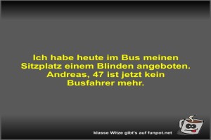 | Ich habe heute im Bus meinen Sitzplatz einem Blinden... Bild (24.11 KB) 1Lustiges → klasse Sprüche und Witze | Lustiges → klasse Sprüche und Witze | heute-10:34 | Fossy | |