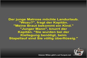 | Der junge Matrose möchte Landurlaub Bild (35.84 KB) von Fossy am 30. Januar 2026 um 13:10 Uhr Lustiges → klasse Sprüche und Witze | Lustiges → klasse Sprüche und Witze | heute-13:10 | Fossy | ||