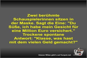 | Zwei berühmte Schauspielerinnen sitzen in der Maske Bild (44.13 KB) 1Lustiges → klasse Sprüche und Witze | Lustiges → klasse Sprüche und Witze | heute-10:56 | Fossy | |