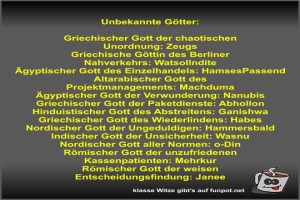 1 | ![]() ![]() ![]() | Unbekannte Götter Bild (68.79 KB) 1Lustiges → klasse Sprüche und Witze | Lustiges → klasse Sprüche und Witze | 12.03.-12:23 | Fossy | |