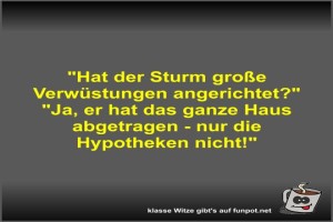 | Hat der Sturm große Verwüstungen angerichtet? Bild (31.13 KB) 1Lustiges → klasse Sprüche und Witze | Lustiges → klasse Sprüche und Witze | 07.04.-18:35 | Fossy | |
