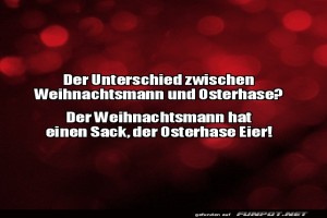 | Der Unterschied zwischen Weihnachtsmann und Osterhase Bild (76.1 KB) 3Lustiges → klasse Sprüche und Witze | Lustiges → klasse Sprüche und Witze | 29.03.24-08:47 | ||