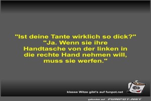 | Ist deine Tante wirklich so dick? Bild (27.7 KB) 1Lustiges → klasse Sprüche und Witze | Lustiges → klasse Sprüche und Witze | 13.04.24-10:59 | Fossy | |