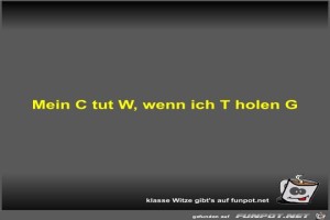 | Mein C tut W, wenn ich T holen G Bild (14.51 KB) 3Lustiges → klasse Sprüche und Witze | Lustiges → klasse Sprüche und Witze | 20.02.24-18:03 | Fossy | |