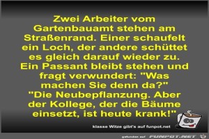 | Zwei Arbeiter vom Gartenbauamt stehen am Straßenrand Bild (57.69 KB) 3Lustiges → klasse Sprüche und Witze | Lustiges → klasse Sprüche und Witze | 19.02.24-19:43 | Fossy | |
