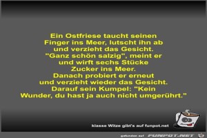 | Ein Ostfriese taucht seinen Finger ins Meer Bild (39.01 KB) 2Lustiges → klasse Sprüche und Witze | Lustiges → klasse Sprüche und Witze | 17.02.24-09:47 | Fossy | |
