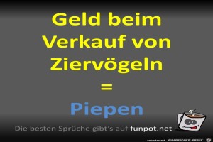 | Piepen Bild (57.34 KB) 3Lustiges → klasse Sprüche und Witze Das Geld vom Verkauf von Ziervögeln Piepen zu nennen, ist doch eine lustige Idee. Übrigens ist heute der Liebe-dein-Haustier-Tag ;-) | Lustiges → klasse Sprüche und Witze | 15.02.24-11:05 | ||