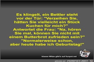 | Es klingelt, ein Bettler steht vor der Tür Bild (45.46 KB) 3Lustiges → klasse Sprüche und Witze | Lustiges → klasse Sprüche und Witze | 12.02.24-20:29 | Fossy | |