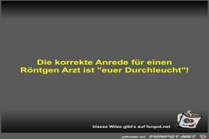 | Die korrekte Anrede für einen Röntgen Arzt ist euer... Bild (18.35 KB) 2Lustiges → klasse Sprüche und Witze | Lustiges → klasse Sprüche und Witze | 12.02.24-11:51 | Fossy | |