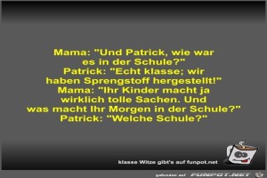 | Mama: Und Patrick, wie war es in der Schule? Bild (36.3 KB) 4Lustiges → klasse Sprüche und Witze | Lustiges → klasse Sprüche und Witze | 08.02.24-09:29 | Fossy | |