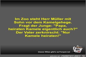 | Im Zoo steht Herr Müller mit Sohn vor dem Kamelgehege Bild (32.22 KB) 4Lustiges → klasse Sprüche und Witze | Lustiges → klasse Sprüche und Witze | 04.02.24-17:25 | Fossy | |