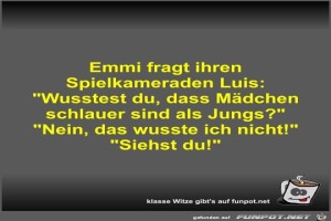 | Emmi fragt ihren Spielkameraden Luis Bild (33.13 KB) 1Lustiges → klasse Sprüche und Witze | Lustiges → klasse Sprüche und Witze | 01.02.24-12:13 | Fossy | |