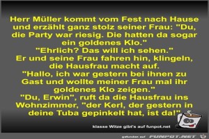 | Herr Müller kommt vom Fest nach Hause und erzählt ganz... Bild (63.29 KB) 3Lustiges → klasse Sprüche und Witze | Lustiges → klasse Sprüche und Witze | 28.01.24-10:28 | Fossy | |