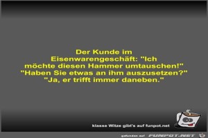 | Der Kunde im Eisenwarengeschäft Bild (26.06 KB) 4Lustiges → klasse Sprüche und Witze | Lustiges → klasse Sprüche und Witze | 06.11.23-11:02 | Fossy | |