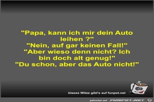 | Papa, kann ich mir dein Auto leihen ? Bild (32.09 KB) 3Lustiges → klasse Sprüche und Witze | Lustiges → klasse Sprüche und Witze | 02.11.23-12:59 | Fossy | |