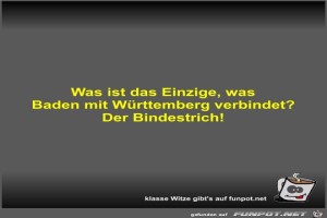 | Was ist das Einzige, was Baden mit Württemberg verbindet? Bild (20.57 KB) 2Lustiges → klasse Sprüche und Witze | Lustiges → klasse Sprüche und Witze | 29.10.23-12:08 | Fossy | |