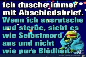 | Ich dusche Bild (54.56 KB) 5Lustiges → klasse Sprüche und Witze | Lustiges → klasse Sprüche und Witze | 25.10.23-08:33 | ||
