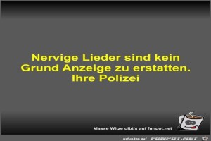 | Nervige Lieder sind kein Grund Anzeige zu erstatten Bild (21.59 KB) 4Lustiges → klasse Sprüche und Witze | Lustiges → klasse Sprüche und Witze | 22.10.23-19:43 | Fossy | |