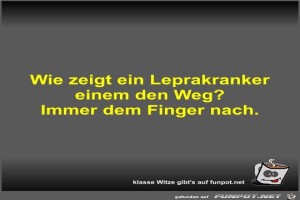 | Wie zeigt ein Leprakranker einem den Weg? Bild (22.89 KB) von Fossy am 22. Oktober 2023 um 15:04 Uhr Lustiges → klasse Sprüche und Witze | Lustiges → klasse Sprüche und Witze | 22.10.23-15:04 | Fossy | ||