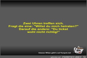 | Zwei Uhren treffen sich Bild (22.16 KB) 5Lustiges → klasse Sprüche und Witze | Lustiges → klasse Sprüche und Witze | 18.10.23-18:12 | Fossy | |