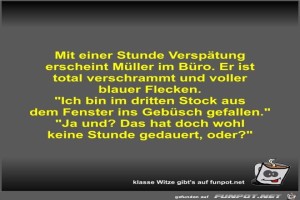 | Mit einer Stunde Verspätung erscheint Müller im Büro Bild (39.63 KB) 4Lustiges → klasse Sprüche und Witze | Lustiges → klasse Sprüche und Witze | 19.10.23-09:34 | Fossy | |