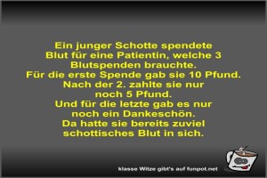 | Ein junger Schotte spendete Blut für eine Patientin Bild (41.09 KB) 5Lustiges → klasse Sprüche und Witze | Lustiges → klasse Sprüche und Witze | 23.07.-18:13 | Fossy | |
