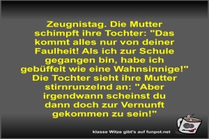 | Zeugnistag: Die unerwartete Wendung Bild (51.77 KB) 1Lustiges → klasse Sprüche und Witze | Lustiges → klasse Sprüche und Witze | 22.07.-17:54 | Fossy | |