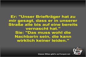 | Er: Unser Briefträger hat zu mir gesagt Bild (38.05 KB) von Fossy am 21. Juli 2025 um 18:15 Uhr Lustiges → klasse Sprüche und Witze | Lustiges → klasse Sprüche und Witze | 21.07.-18:15 | Fossy | ||