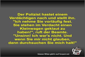| Der Polizist hastet einem Verdächtigen nach und stellt ihn Bild (45.57 KB) 2Lustiges → klasse Sprüche und Witze | Lustiges → klasse Sprüche und Witze | 20.07.-10:19 | Fossy | |