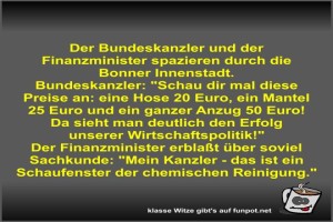 |  2 |       | Der Bundeskanzler und der Finanzminister spazieren durch... Bild (55.13 KB)  2 Lustiges → klasse Sprüche und Witze | Lustiges → klasse Sprüche und Witze | 16.07.-17:34 | Fossy | |