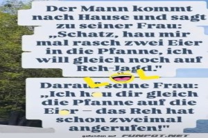| Eier, Pfanne, Reh ? Ehehumor pur! Bild (79.26 KB) 1Lustiges → klasse Sprüche und Witze | Lustiges → klasse Sprüche und Witze | 11.07.-17:17 | ||