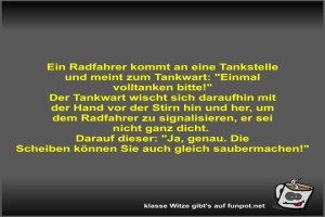 | Ein Radfahrer kommt an eine Tankstelle und meint zum... Bild (38.57 KB) 1Lustiges → klasse Sprüche und Witze | Lustiges → klasse Sprüche und Witze | 05.07.-12:40 | Fossy | |
