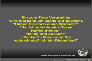 | Ein zum Tode Verurteilter wird morgens um sechs Uhr geweckt Bild (35.34 KB) 3Lustiges → klasse Sprüche und Witze | Lustiges → klasse Sprüche und Witze | 07.01.23-09:28 | Fossy | |
