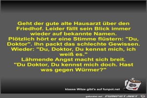 | Geht der gute alte Hausarzt über den Friedhof Bild (49.38 KB) 4Lustiges → klasse Sprüche und Witze | Lustiges → klasse Sprüche und Witze | 05.01.23-13:22 | Fossy | |