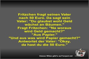 | Fritzchen fragt seinen Vater nach 50 Euro Bild (41.18 KB) 2Lustiges → klasse Sprüche und Witze | Lustiges → klasse Sprüche und Witze | 24.10.-13:05 | Fossy | |